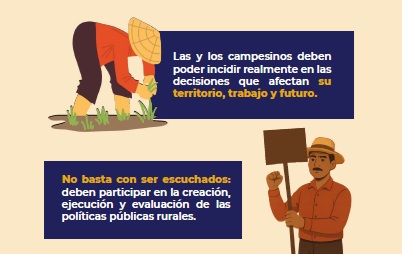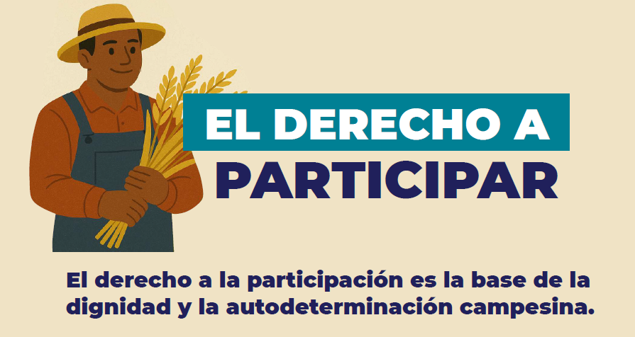 El derecho a la participación está consagrado en la Declaración de Derechos Campesinos y otras personas que trabajan en zona rural (UNDROP) en el Artículo 10 de la misma.